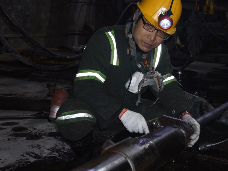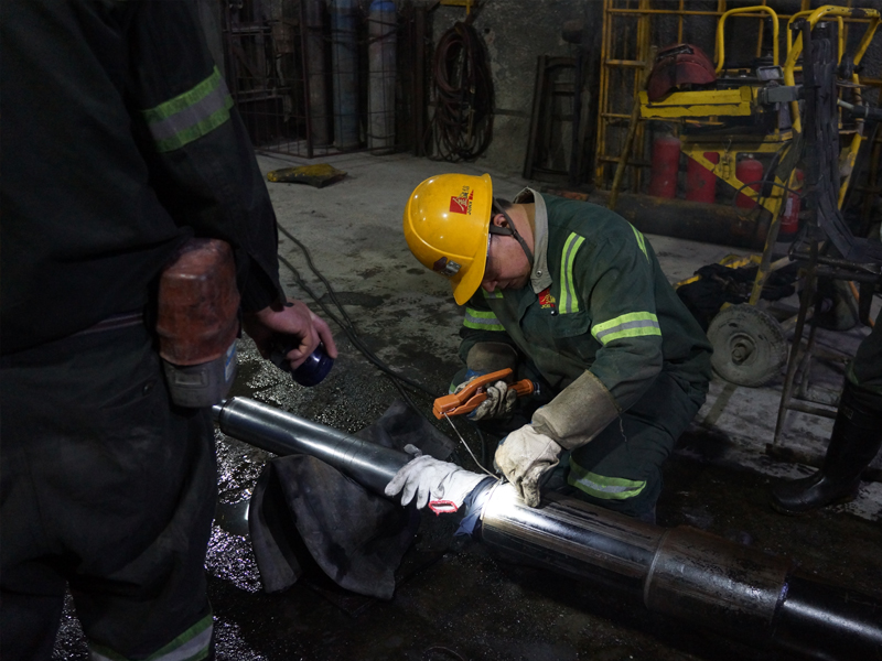 见到陈培亚是正月十五上午在首云矿区-61的维修硐室里,他正在协助维修师傅从SIMB1354中深孔台车拆卸下来硕大的推进杆里,要将折断在里面一颗只有烟头大的螺丝,通过电焊烧灼后将其拧卸出来。