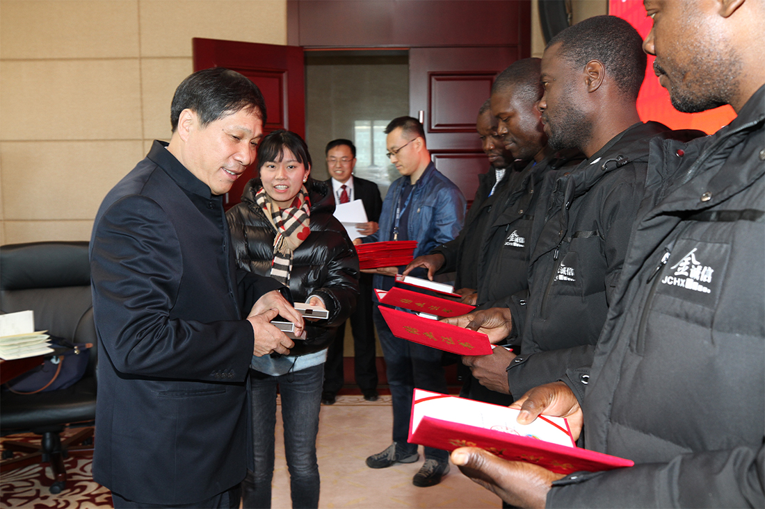 12月30日上午,顺利完成 “一带一路”培训课程的海外员工们来到金诚信公司总部出席毕业典礼,受到了中国有色金属工业协会党委副书记、纪委书记范顺科,金诚信党委书记、董事长王先成的热烈欢迎。参加会议的领导还有公司副总裁张俊、公司首席安全专家刘云昌、公司总裁助理兼人力资源管理中心总经理刘风坤、有色金属人才中心副总经理宋凯、北京工业职业技术学院国际交流处处长唐正清等。