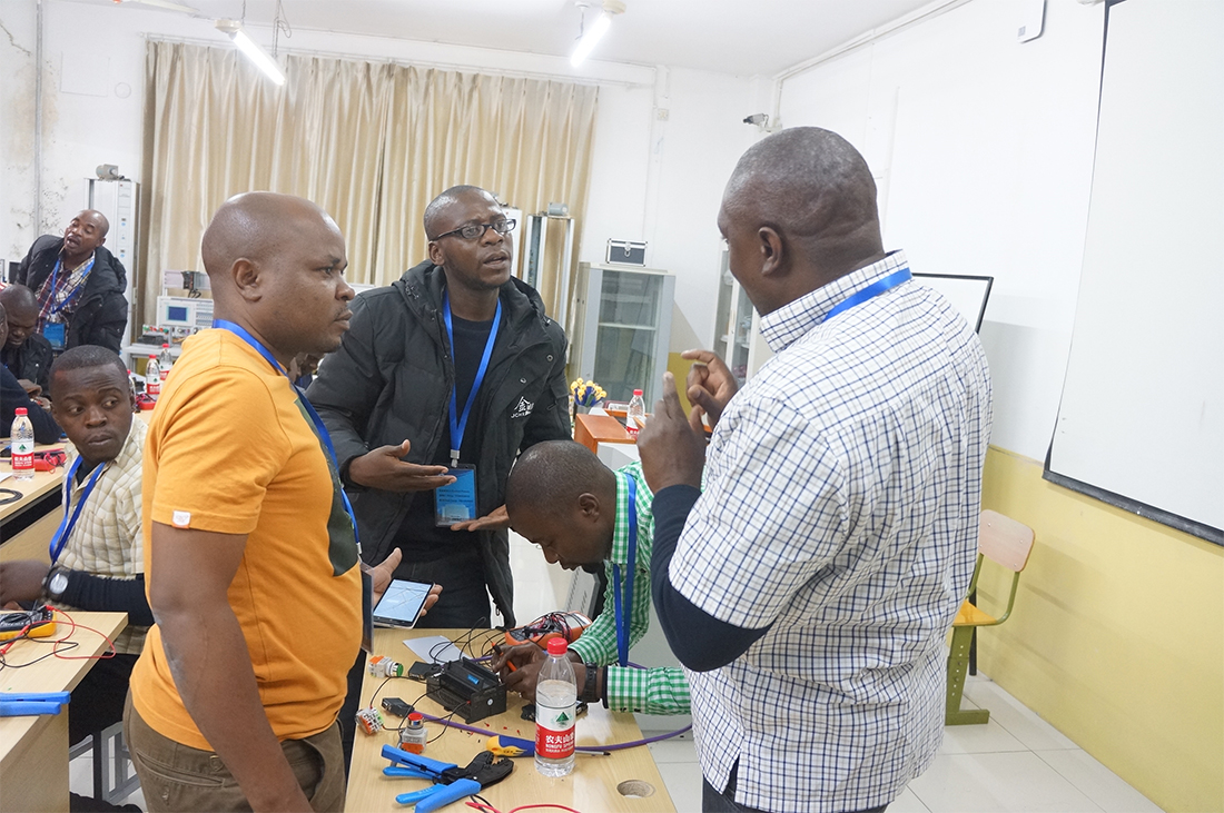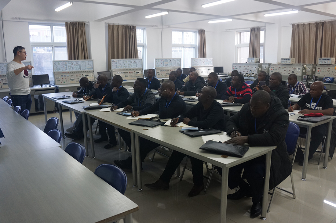 开课的第二天,校方安排了电机维修及控制技术的课程。在设备先进的电机实验室里,授课老师根据海外矿山的工作特点提前进行了精心准备。在授课中,老师通过图文并茂的方式对电机的种类、工作原理和模式、故障维修等进行了详细的介绍及讲解。学员们认真听讲,不断踊跃回答老师提问并提出问题,很快理解并掌握了相关知识。在理论知识后,老师安排了电机实操,这对学员们有着很强的吸引力。学员们在完成分组后,以小组为单位共同努力进行了电机电路的连接和工作模式模拟。经过了一下午的努力,各小组均出色完成了老师所设置的各项课题。