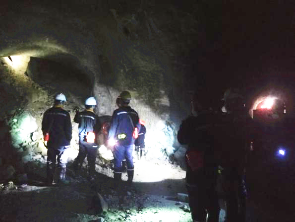 上午9时许,中国黄金国际公司考察组一行在项目部经理童建华陪同下深入现场,先后对3736m水平拉底爆破现场、3730m水平出矿穿脉、3660m水平电机运输、3600m水平旋回破碎等工艺流程进行参观。参观组一行在3720出矿水平N1穿脉恰巧遇到了铲运机在进行出矿作业。郭仲新等一行客人对项目部采用的先进设备和技术以及年轻台车工熟练的操作赞誉有加,对中深孔布置方式、施工工艺等表示出极大的兴趣,特别是对DU411大孔台车施工的聚矿槽大孔进行了特别关注。他们认为,金诚信在无轨化、大型化、智能化道路上无疑是先行者和探路人。