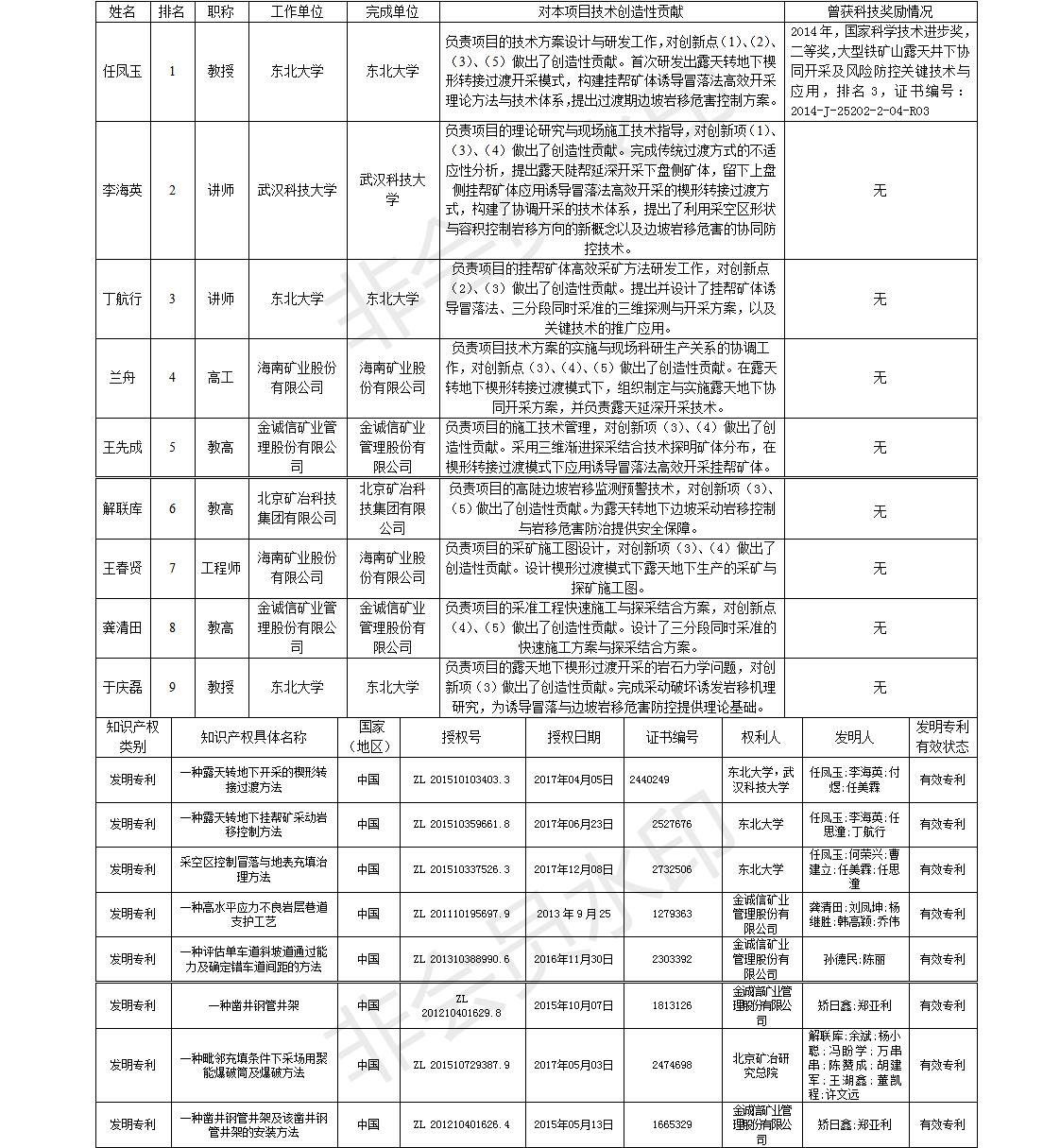 1.露天转地下楔形过渡开采关键技术研究与应用,获2016年中国钢铁工业协会、中国金属学会冶金科学技术奖一等奖;