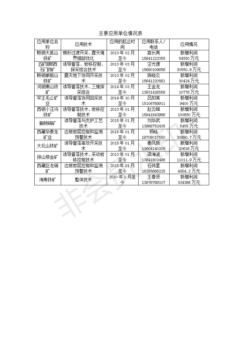 项目研究成果先后在鞍钢、西钢、河钢、中金、五矿等集团所属的20余家单位推广应用,经济、社会和环境效益显著,对金属采掘业的露天地下协同过渡高效开采及风险防控具有重要的推广价值和示范作用。项目有关技术成果主要推广应用情况见下表。
