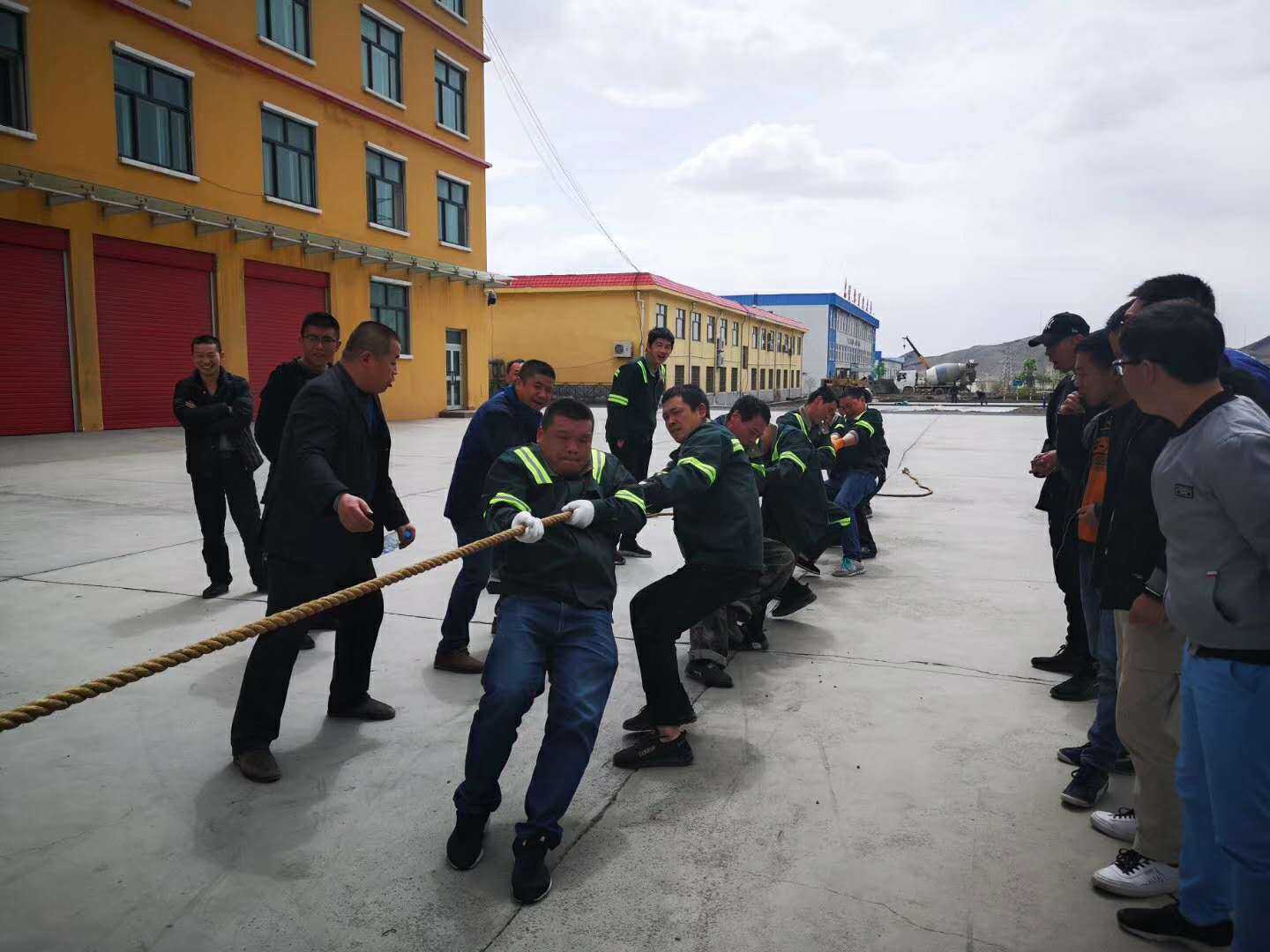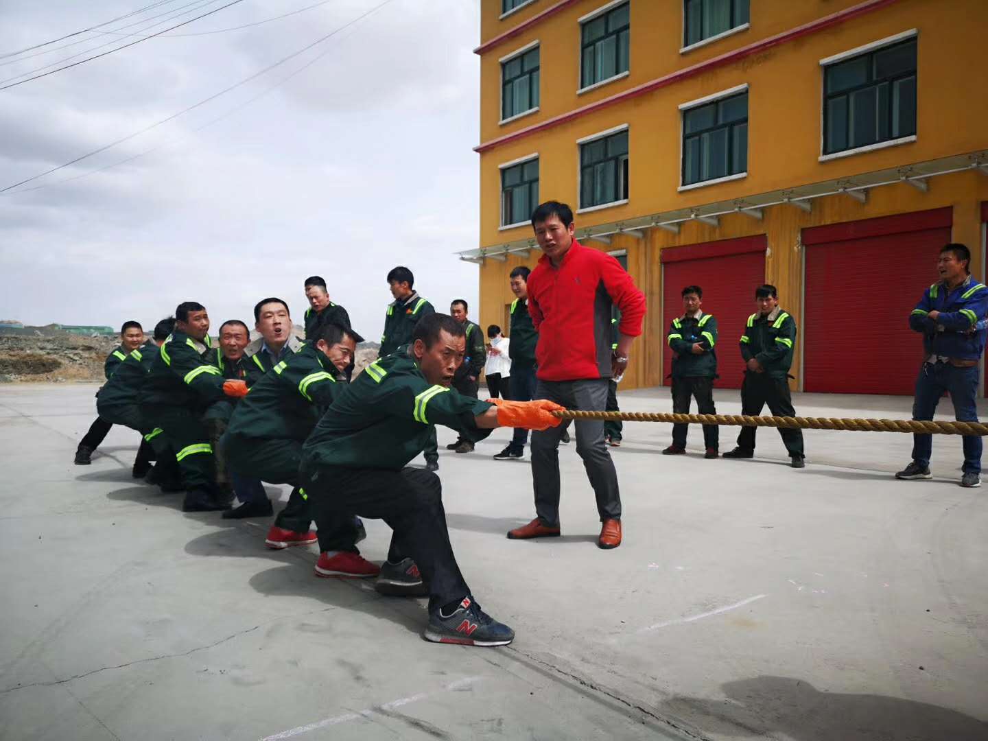 一根粗绳将一个集体绑在了一起。除了紧紧抓住绳子的双方十六名参赛选手外,还有场外助阵的“战友”们以及啦啦队。当比赛得哨声响起,只见参赛的队员都紧握长绳,卯足了劲往后拉。未参赛员工组成的啦啦队,个个热情高涨地在一旁为比赛的队友们呐喊助威,欢呼声、呐喊声此起彼伏,氛围都特别激烈,富有节奏的欢呼呐喊声在办公楼前的上空久久回荡……经过一番努力拼搏,采矿工区在本次比赛中获得第一名。