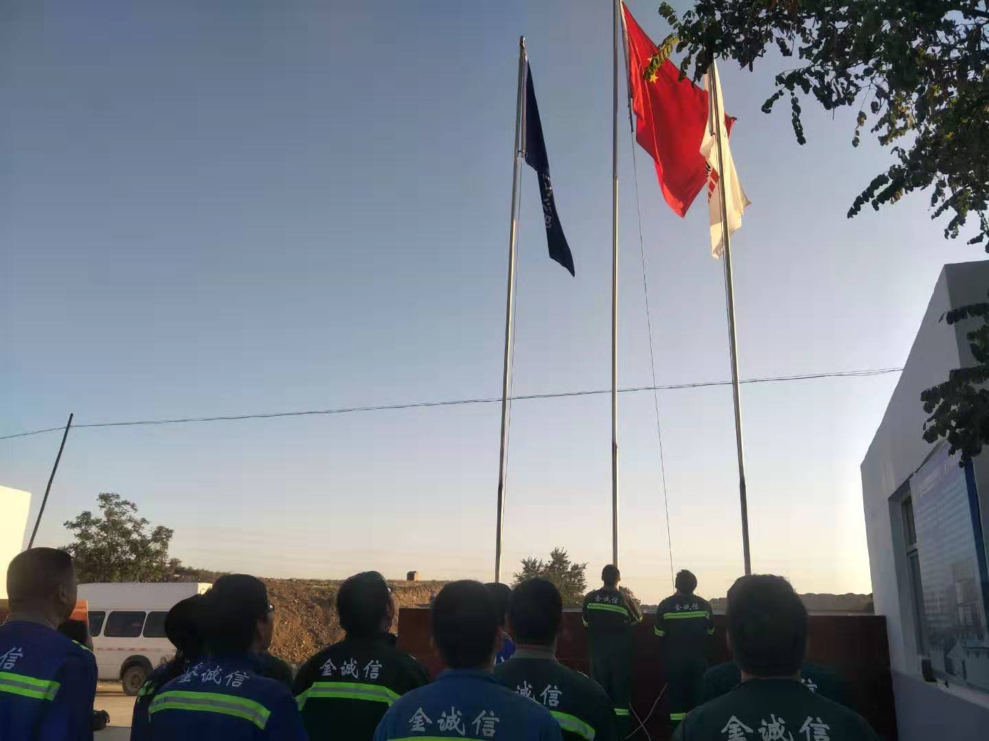 国庆节清晨7:30,项目部所有管理人员统一穿着干净整洁的金诚信工作服,在项目部旗台下举行了庄严而简朴的升旗仪式,大家高唱国歌,庆祝祖国生日的到来。