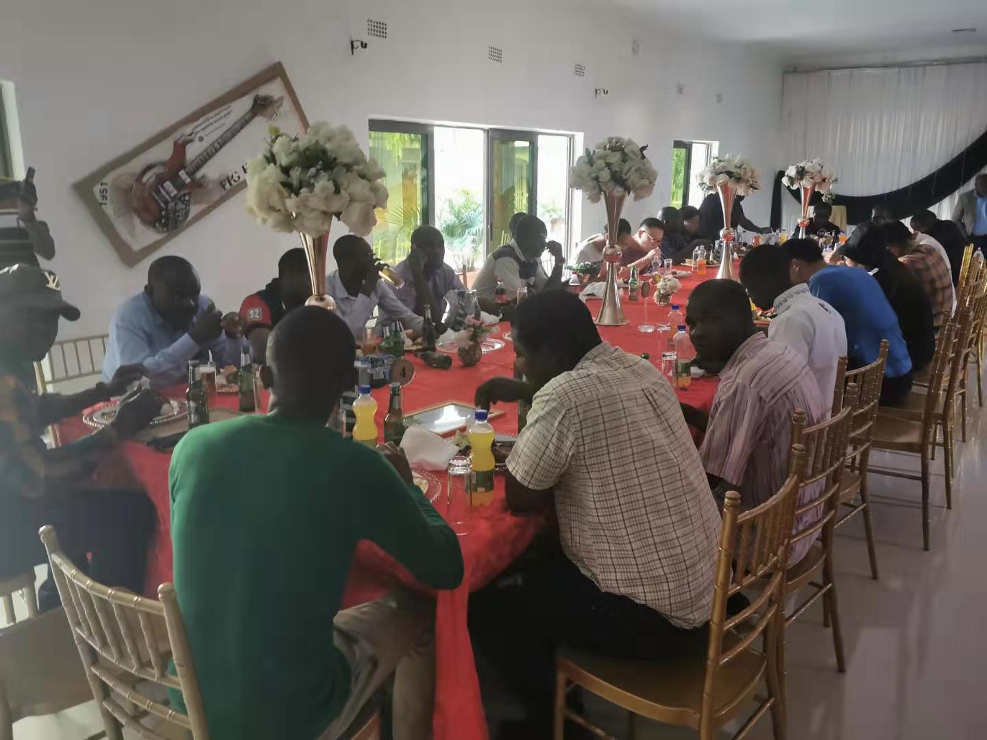 颁奖典礼结束后,大家纷纷合影留念,记住这美好的时刻。晚上6时,宾客们开始在宴会厅享受丰盛的自助美食,享用美酒佳肴的同时,中外方人员谈笑风生,举杯同庆,喜迎圣诞。大家都很珍惜圣诞节前的团聚时刻,而身在异国他乡的中方员工也与赞方员工、其他外籍员工共享节日欢乐,把心凝聚在一起,增进了团结,促进了友谊,提升了中外融合。(罗评)