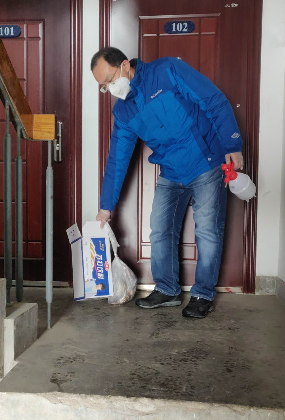 从那一天起,在各管理管控小组成员到位之前,他一个人负责起消毒、打水、接人、登记,制证、送货、清理生活垃圾等各项工作。宿舍楼四个单元共六层、办公楼4层、培训楼3层,每天这些地方一天都会跑上两次。上午下楼时一手提着消毒壶,一手拿着水桶;下午下楼时一手消毒喷壶一手拿隔离人员的生活垃圾。园区里,因他一个人忙碌的身影而不再显得寂静。