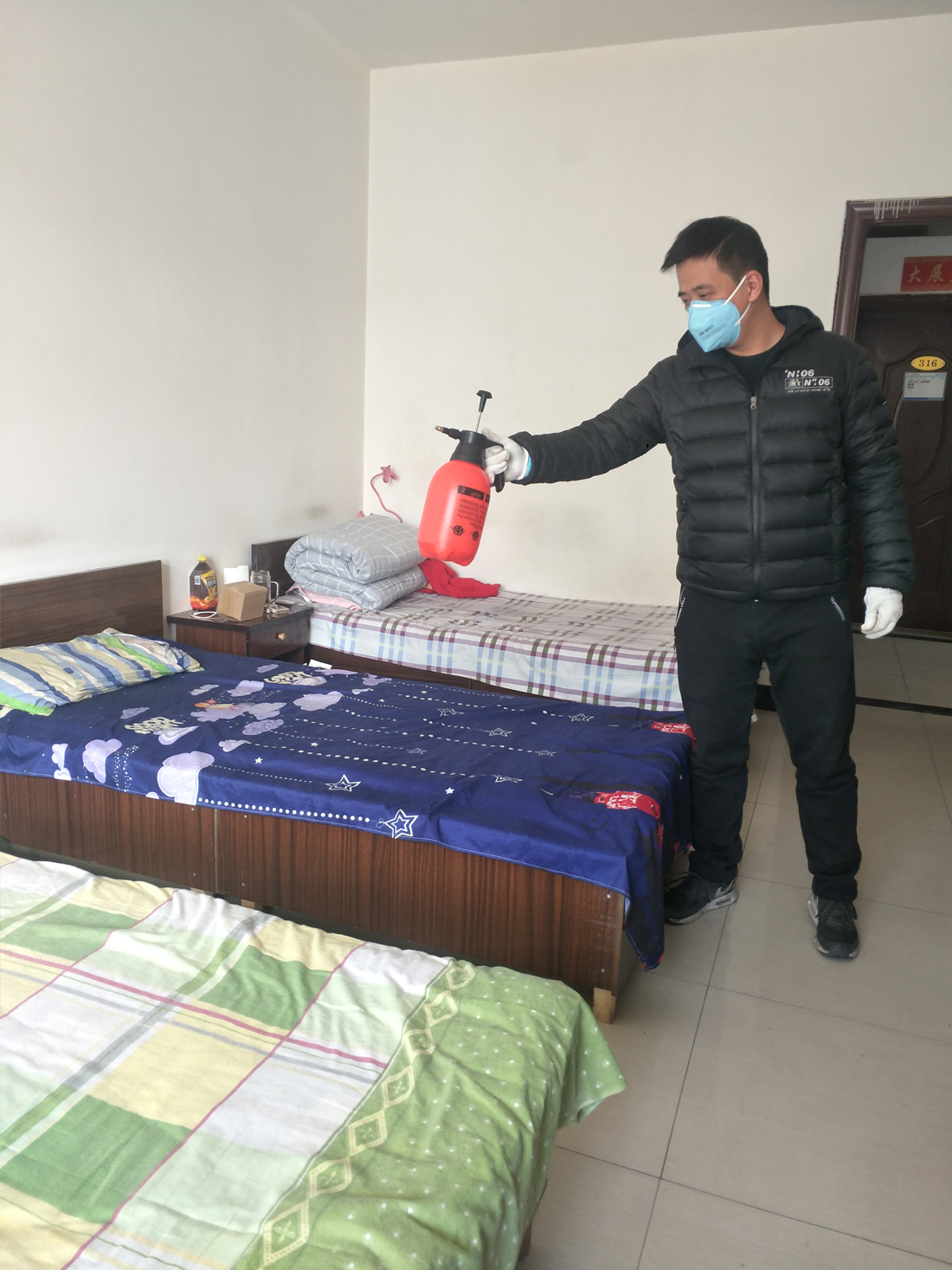 1月26日开始,肃北县政府、当地派出所、业主方及两级公司等各单位纷纷下发通知,要求项目部进行人员健康状况排查。面对各个单位不同模板的排查报表,董经理要求办公室和安全室每天监测员工体温,在工作群里汇总人员健康情况,然后由他亲自整理上报。他真正做到了对项目部现有人员情况了如指掌,随口说一个名字,他就能报出相关信息。为了确保信息的准确性,他每天晚上都带领管理人员进行宿舍检查,并手拎一个喷壶随时消毒。检查宿舍时,不时叮嘱员工戴好口罩,注意通风,小心感冒等,用朴素的关心温暖每位员工的心。