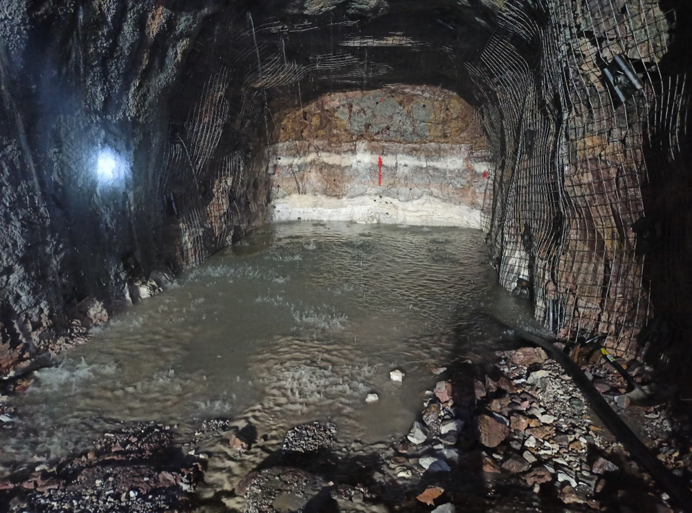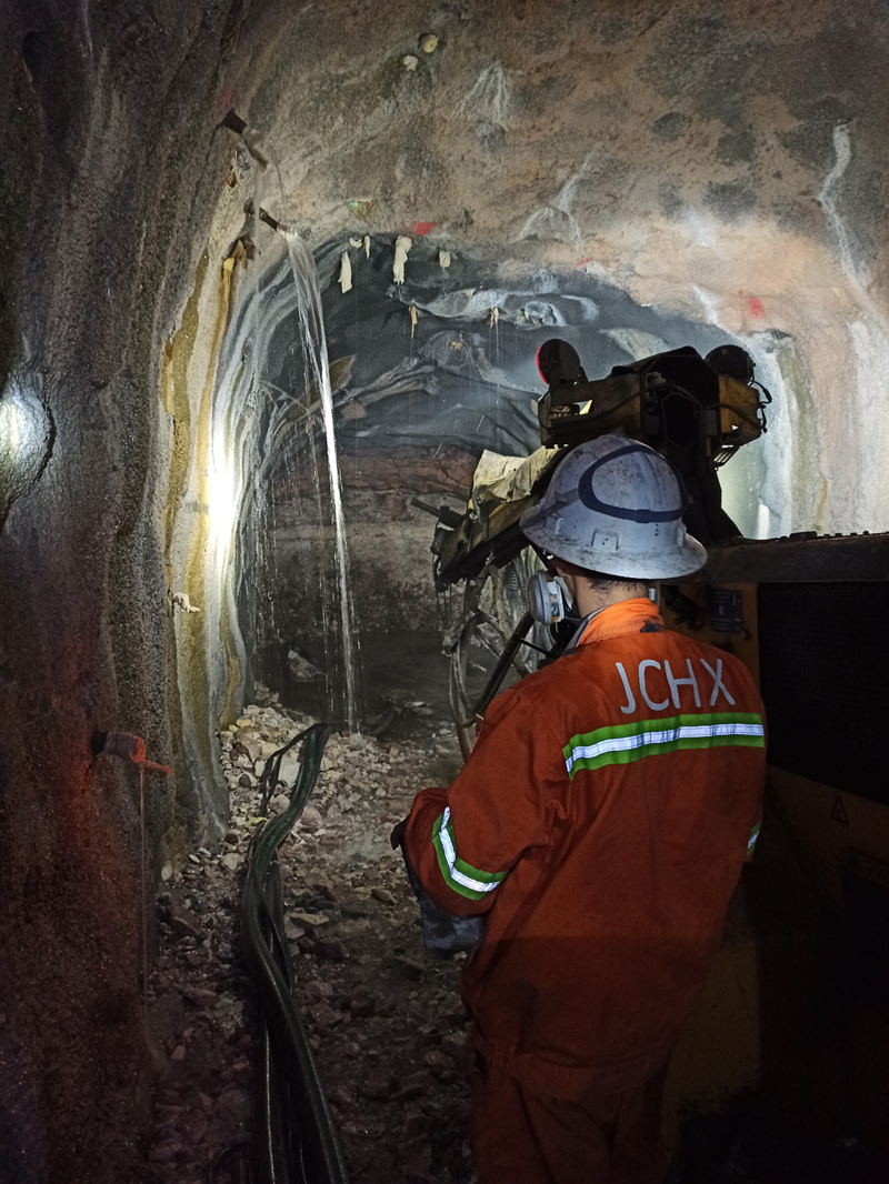 万宝项目公司承建的措施斜坡道工程为业主方的重点工程,其净断面4.2m×4.2m,设计为腰线上锚网支护,-17.5%下延施工,总长926m,为科米卡二期基建工程的关键线路,对整个施工工期起着重大决定作用。该工程自2019年11月14日施工至565m含水层时遇较大涌水,后重点进入排水、注浆治水阶段。今年4月20日恢复掘进,重新进入掘进、间隔注浆阶段。