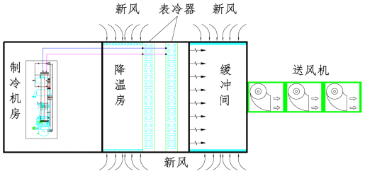 经过多方面比较,项目部最终购置了一台型号为40STE-FM780AD4的制冷机。该设备采用全新风循环,表冷器出来的冷风,通过原有风机经玻璃钢风筒送入矿井作业面,使作业面温度保持在25~28℃。过渡季节及冬季通过焓差控制采用新风模式,减少或者停止制冷主机的运行。同时,该设备实现全自动控制,通过微电脑集中管理,汇集成简单的操作方式,可以远程操控、远程监视、一键启动等,实现主要设备即时监控,无需专人管理。