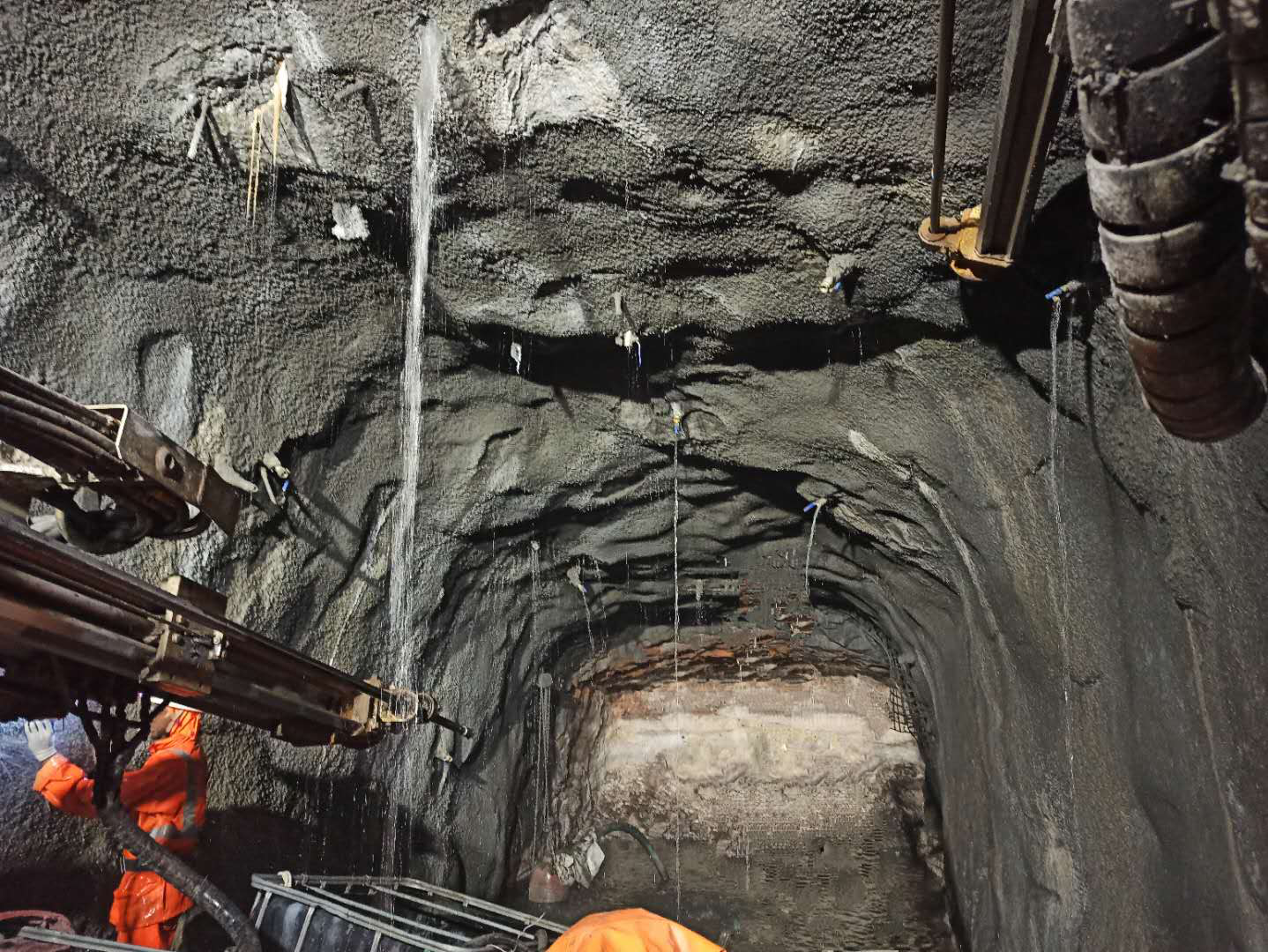 工程自2019年11月14日施工至含水层(K0+ 563m处)遇较大涌水后进入排水、注浆治水阶段。经过艰难的排水与注浆,今年4月20日恢复掘进,进入掘进、间隔注浆(迎头帷幕注浆及开挖后出水点壁后注浆)阶段。