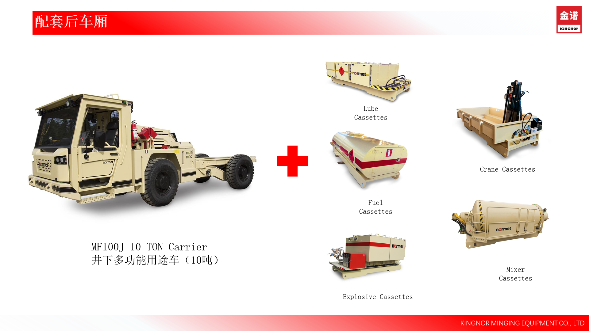 金诺矿山设备有限公司系金诚信与芬兰挪曼尔特公司合作,在湖北大冶市成立的中外合资企业,由金诚信控股。公司主要制造井下铰接式矿用多功能服务车系列产品,致力成为全球矿业领域的技术创新型制造公司,为地下矿山提供安全、高效的辅助设备。该服务车可通过快速换装机构,实现一机多用,即一个移动底盘配合多台工作车厢,从而满足不同工作需求。可配置的车辆类型包括:井下人力运输车、混凝土搅拌运输车、自卸材料车、剪式升降平台车、润滑油车、燃油运输车、炸药运输车、检修车等。