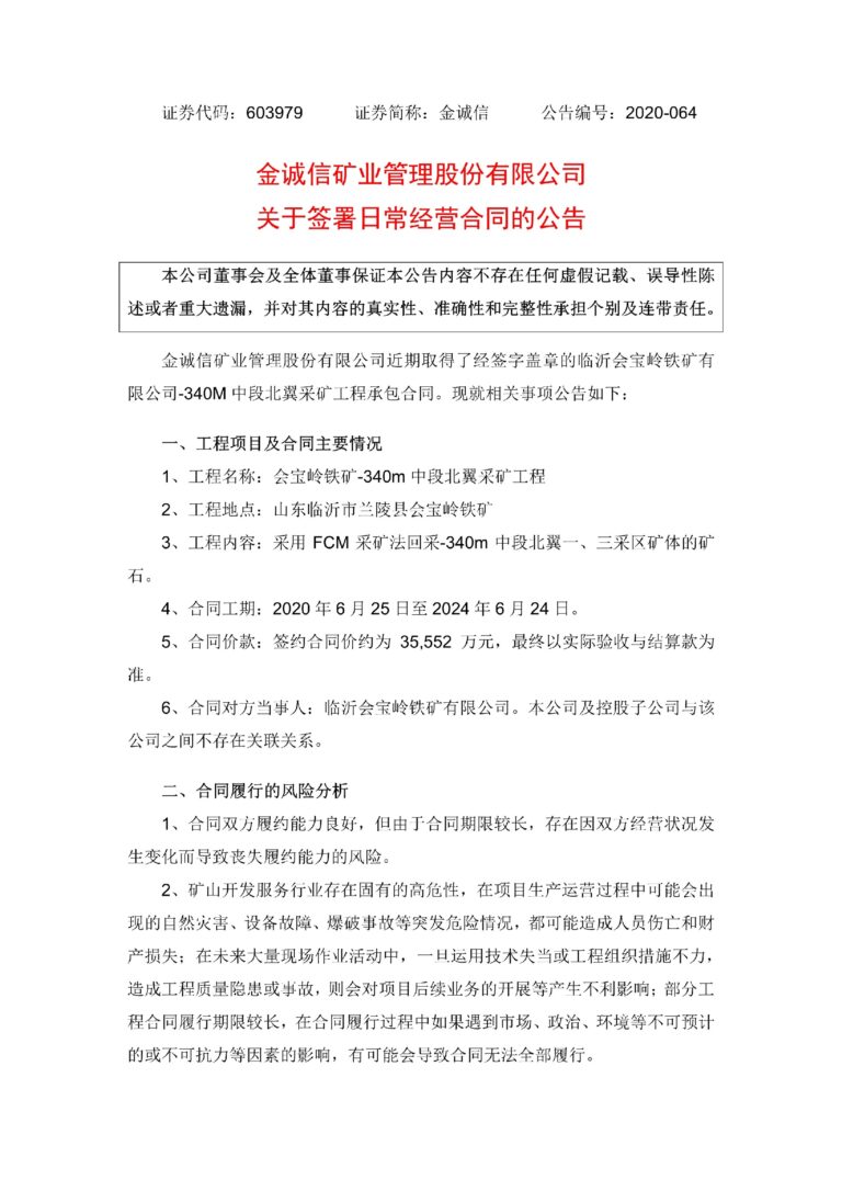 金诚信关于签署日常经营合同的公告