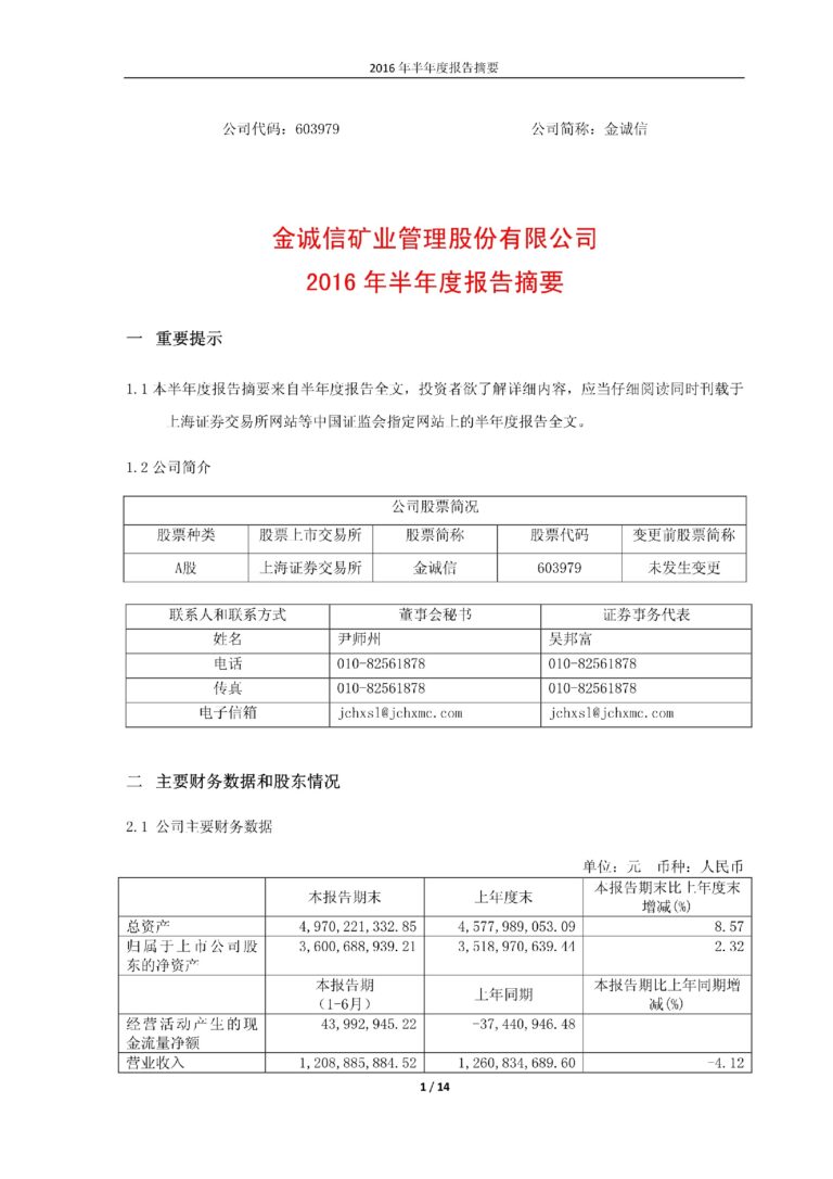 金诚信2016年半年度报告摘要