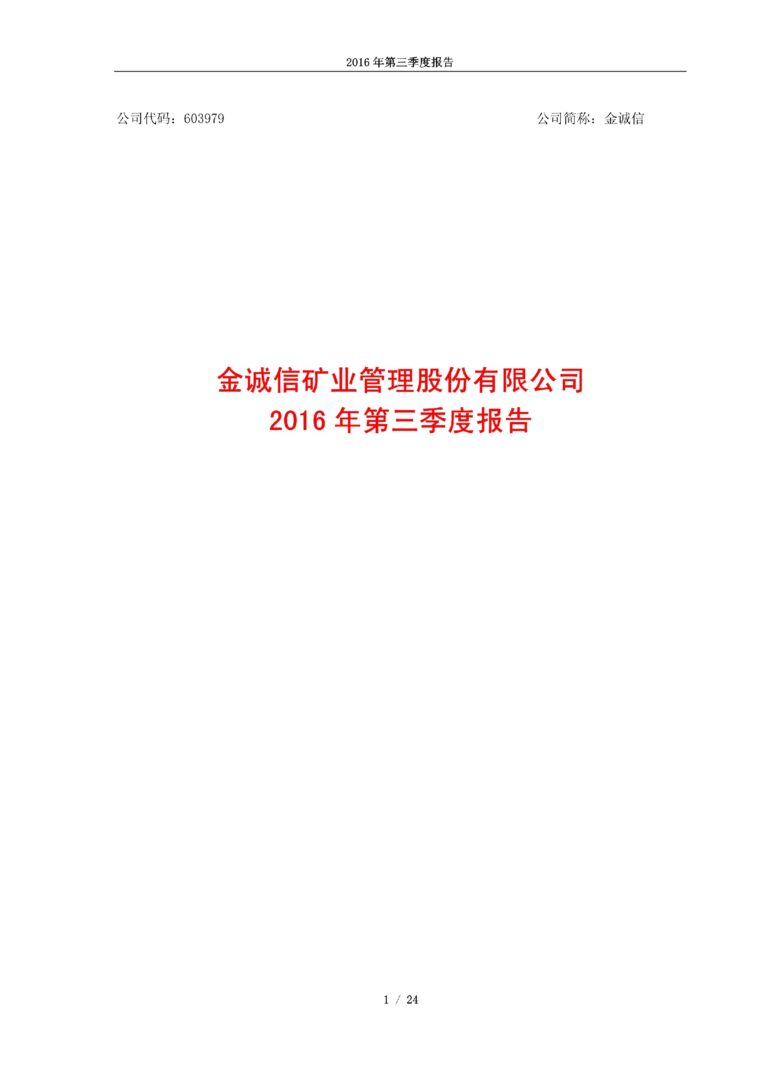 金诚信2016年第三季度报告